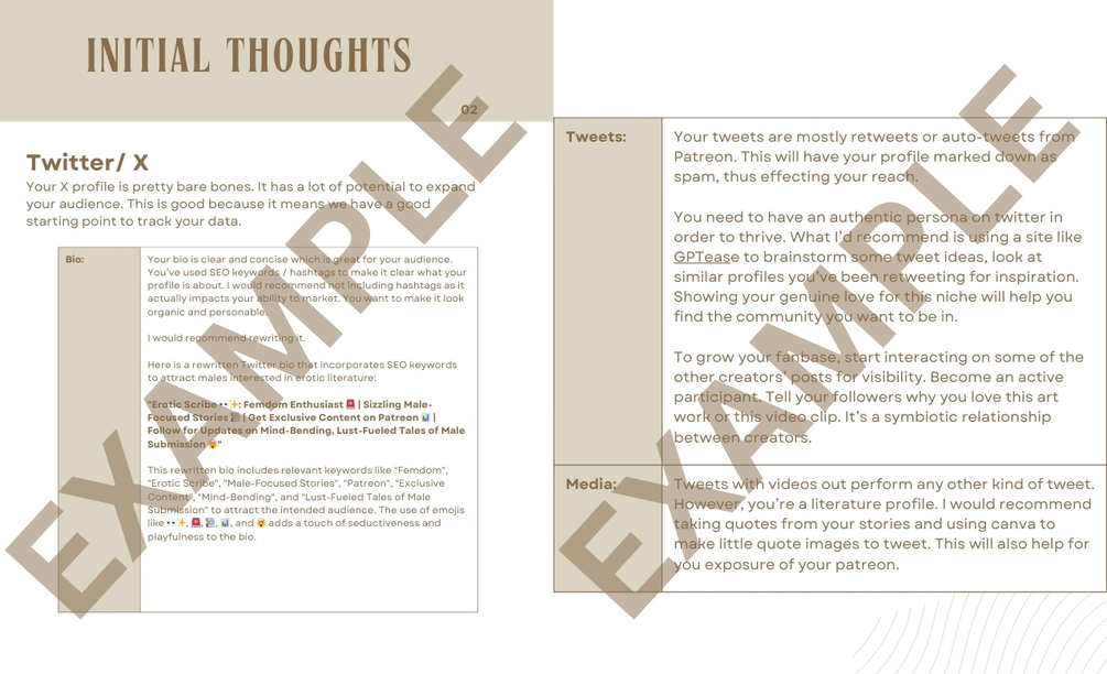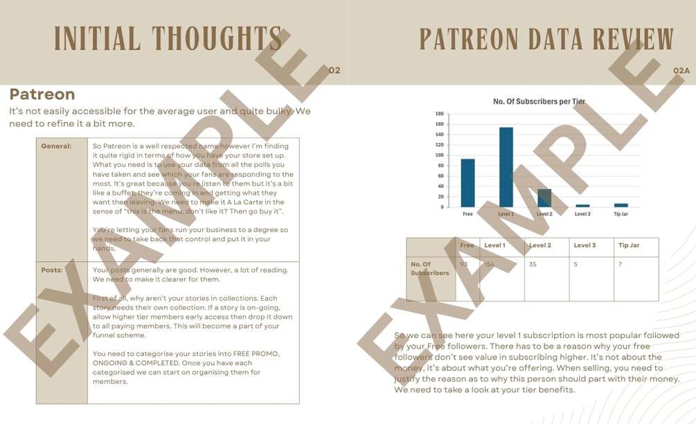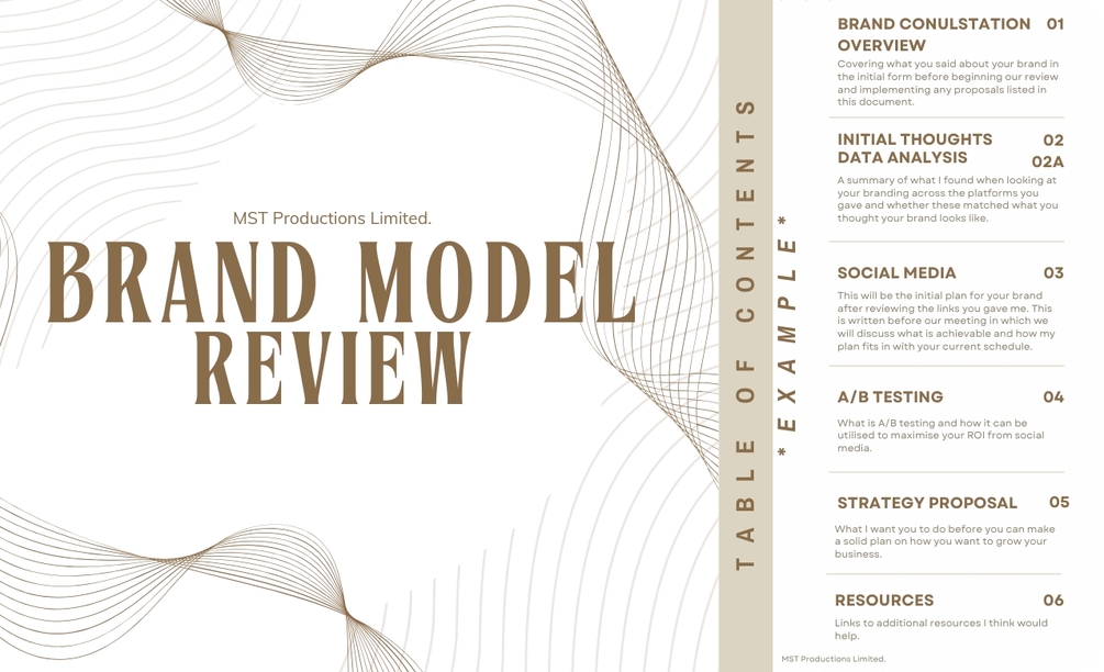 The Branding Model Review consists of a full review of your current branding and marketing model for your business. I will go through your current model and give suggestions on how to improve and/ or additional methods to use to reach the goals you have. This report is completely customised and specific to you and will be written in line of the goals you have given me.
